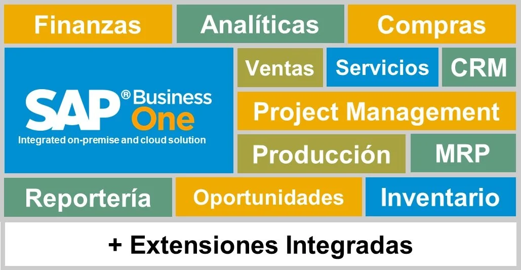 La aplicación SAP Business One® le ofrece una manera asequible de gestionar todo su negocio: desde las finanzas y la contabilidad, las compras, el inventario, las ventas y relaciones con clientes y la gestión de proyectos, hasta las operaciones y los recursos humanos. SAP Business One le ayuda a optimizar los procesos y a obtener información sobre su negocio para que pueda actuar más rápido y tomar decisiones fundamentadas en tiempo real, lo cual le ayudará a impulsar un crecimiento rentable.